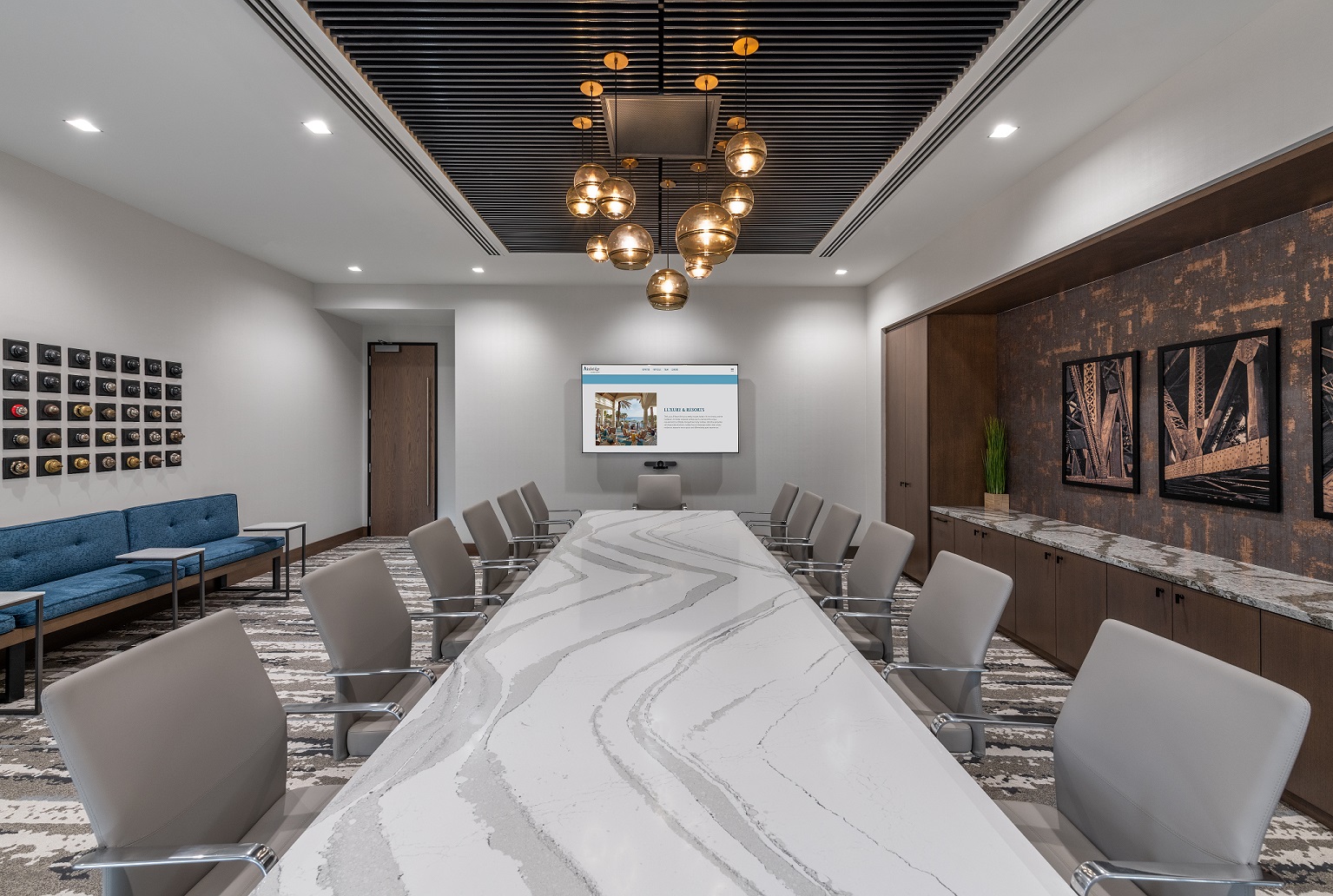 This project is a 244,900 sf, five-story, tilt-wall office building and a seven-level, 1,247-space, precast parking garage. The finish-out scope for Aimbridge Hospitality includes a first floor that resembles a hotel, complete with a lobby, conference rooms, fitness center, patio lounge, and an Ascension Coffee Café. The finish-out also includes multiple floors of office space and features an extensive executive suite on the top floor.